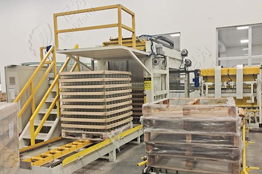 6)本機設計有空棧自動收集裝置,升降動力電機加以變頻控制,空棧托舉梁由氣缸帶動,可自動開合,碼垛整齊、方正。承載棧板數(shù)量可達12塊。