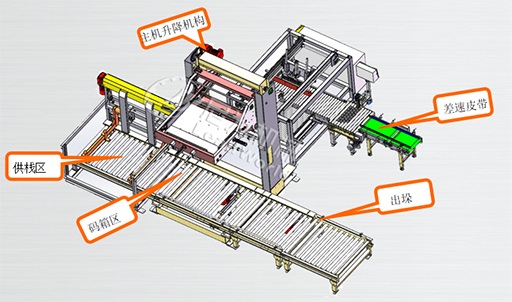 結(jié)構(gòu)骨架為焊接結(jié)合方式,堅固耐用并具有可調(diào)底座功能,主升降臺采用SEW電機傳動,入口加速輸送帶將進箱分離,堆棧區(qū)動力滾筒輸送,棧板輸出,自由滾筒輸送帶,周圍防護裝置,采用德國西門子PLC控制系統(tǒng),可移動式人機接口,故障自動顯示。