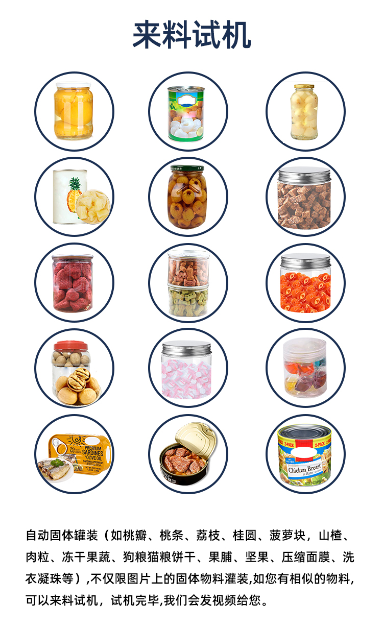 本機廣泛適用于玻璃罐、馬口鐵罐、塑料罐及廣口瓶等多種容器類型。它主要用于沙丁魚、黃桃瓣、桃條、桃丁、梨塊、梨球、山楂、草莓、葡萄、杏、荔枝、紅燒肉、雞肉等罐頭產(chǎn)品的自動計量與裝罐,展現(xiàn)出廣泛的適用性。