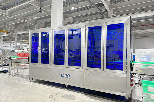 清潔劑灌裝生產(chǎn)線工作流程:灌裝——旋蓋——稱重檢測——膜包收縮——機器人碼垛——纏繞