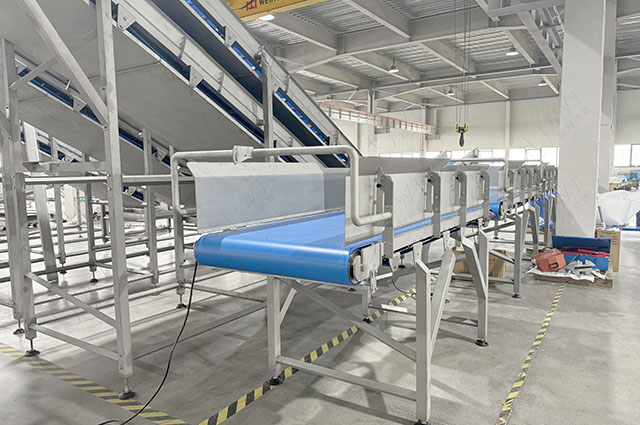 使用自動(dòng)輸送帶將處理好的蔬菜送入包裝環(huán)節(jié)。
