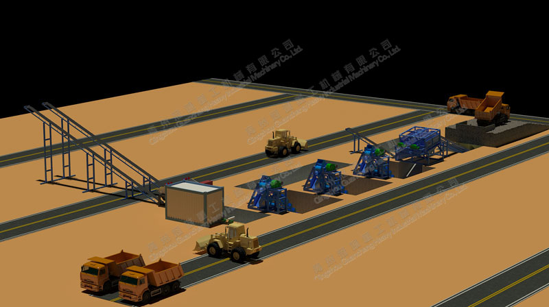 原料通過工程車輛送入進(jìn)料斗,通過料斗底部的振動給料機(jī)均勻給料于上料輸送機(jī),由上料輸送機(jī)均勻輸送至2臺滾筒篩內(nèi)進(jìn)行初步?jīng)_洗并且進(jìn)行篩選分級為粗料與細(xì)料兩種規(guī)格,其中不合格的粗料由廢料輸送機(jī)直接輸送至廢料區(qū)域;合格的細(xì)料排入料池內(nèi),由三臺挖斗式洗沙機(jī)進(jìn)行三次清洗,清洗后的物料排入料池,由一臺沙泵打入海沙淡化脫膜機(jī)內(nèi)進(jìn)行脫膜淡化,淡化后的細(xì)沙由兩臺脫水篩進(jìn)行脫水,后由兩條成品料輸送機(jī)輸送到成品料區(qū)域。