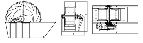 洗砂機(jī)工作時(shí),電機(jī)通過三角帶、減速機(jī)、齒輪減速后帶動葉輪緩慢轉(zhuǎn)動,砂石有給料槽進(jìn)入洗槽中,在葉輪的帶動下翻滾,并互相研磨,除去覆蓋砂石表面的雜質(zhì),同時(shí)破壞包覆砂粒的水汽層,以利于脫水;同時(shí)加水,形成強(qiáng)大水流,及時(shí)將雜質(zhì)及比重小的異物帶走,并從溢出口洗槽排出,完成清洗作用。干凈的砂石由葉片帶走,后砂石從旋轉(zhuǎn)的葉輪倒入出料槽,完成砂石的清洗作用.
