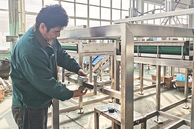 這臺(tái)已經(jīng)組裝完成的設(shè)備是卸籠機(jī)。卸籠機(jī)主要用于各種肉罐頭、蔬菜罐頭及二次滅菌的塑膠瓶飲料等在殺菌后的卸籠工作。