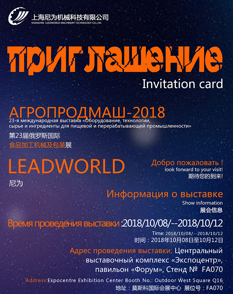 上海尼為機(jī)械科技有限公司誠意邀請您參觀將于2018年第23屆俄羅斯國際食品加工機(jī)械及包裝展-AGROPRODMASH